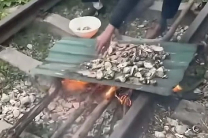 广宁省一对夫妇在铁轨上生火烧烤食物