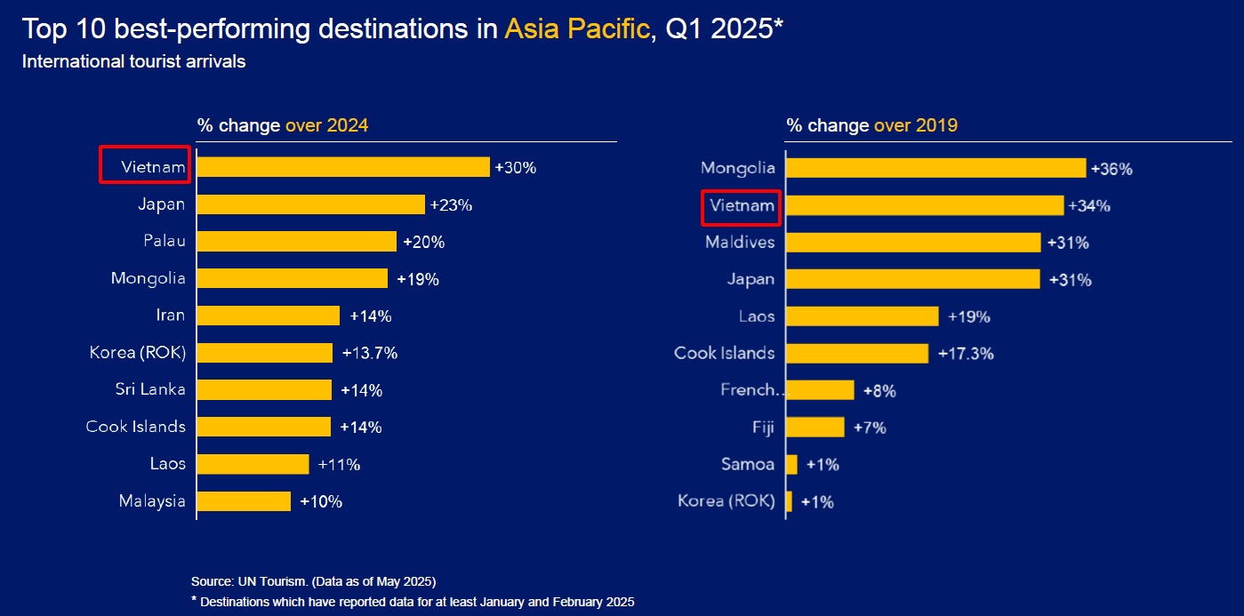 值得注意的是,根据联合国旅游组织的汇总数据,第一季度,越南在亚太地区国际游客增长方面领先(比2024年第一季度增长30%),在国际游客恢复方面排名第二(比2019年第一季度增长34%)。